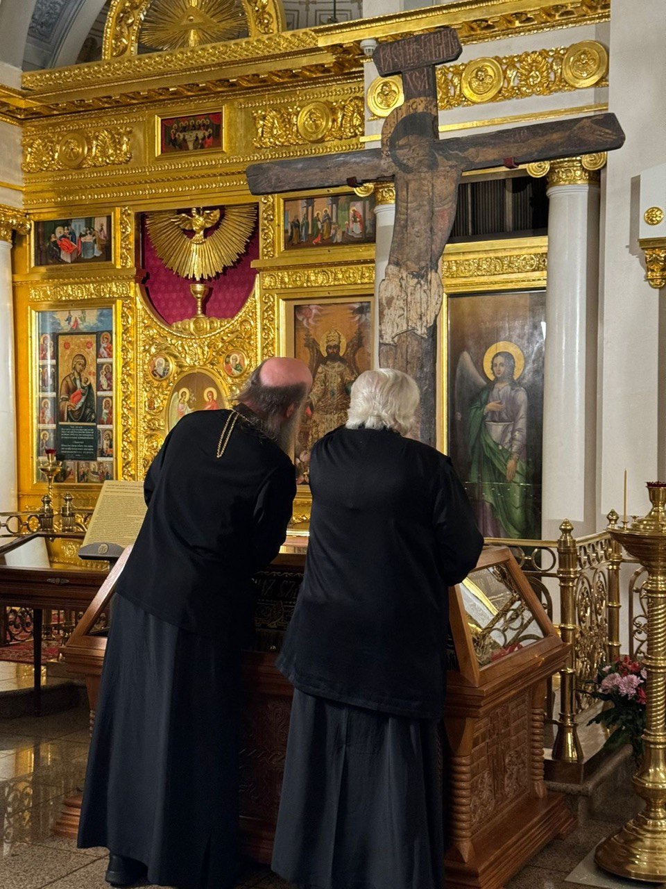 «С помощью одного молодого человека, жившего по соседству от Успенского собора, мы, тщательно запаковав крест, сдали его в багаж большой скорости, и в Москве на извозчике повезли его к Троицким воротам Кремля, в котором помещались тогда реставрационные мастерские, и сдали крест вышедшему из ворот художнику—реставратору Чирикову. Я сам по особому пропуску получил доступ в Кремль. Когда в реставрационных мастерских соединили обе половины креста, то оказалось, что небольшая часть дерева из середины креста выпала, вероятно, при разломе.